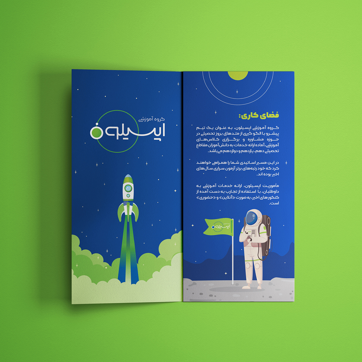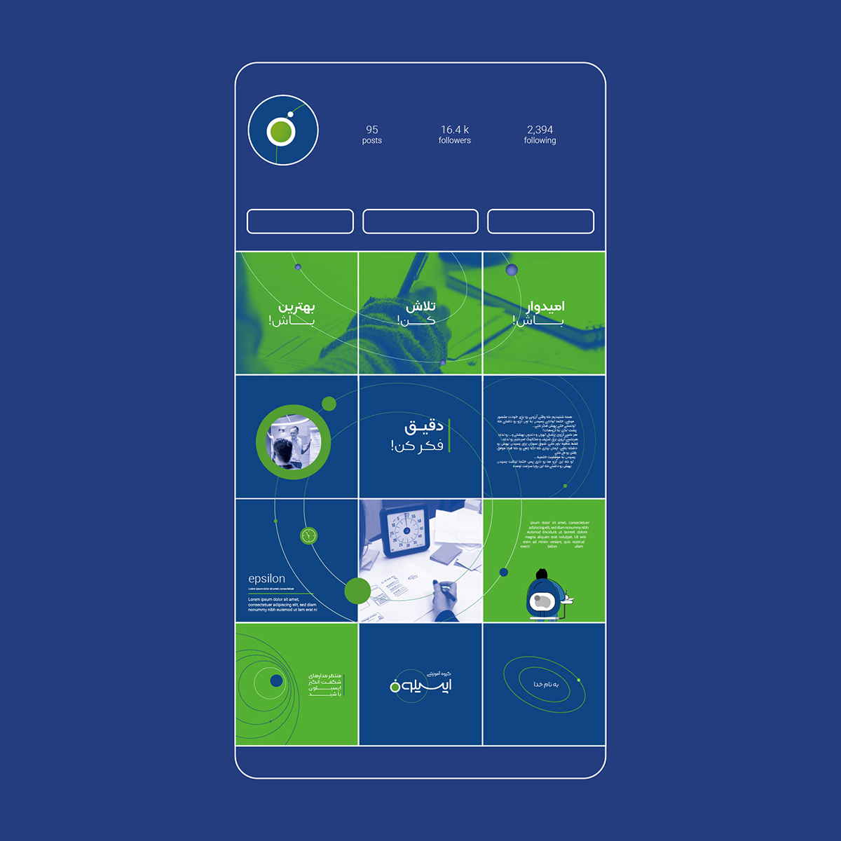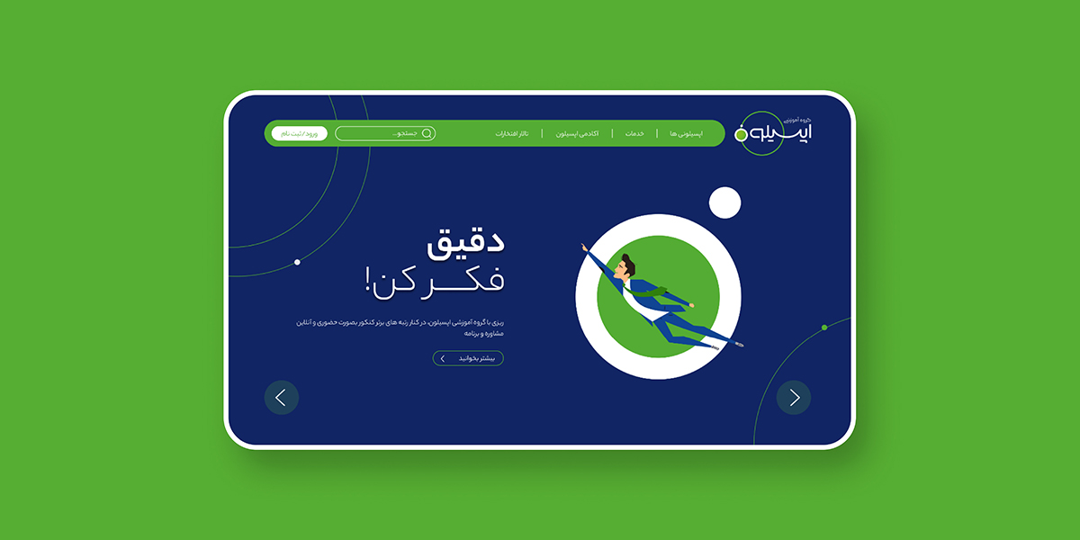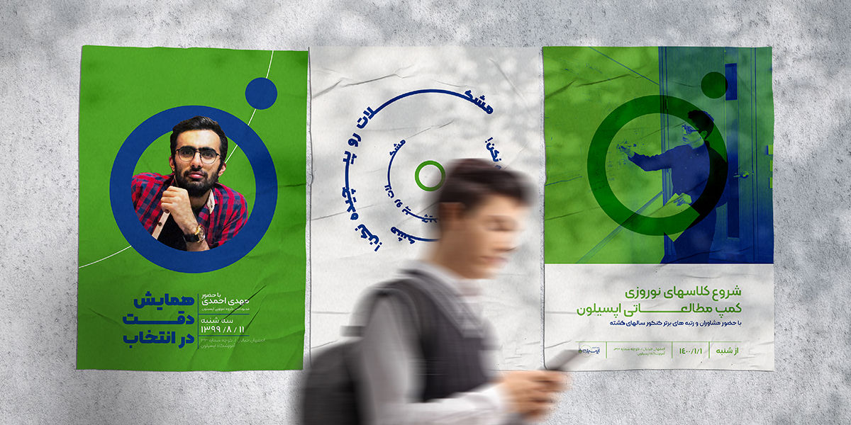 گروه آموزشی کنکور اپسیلون به همت جمعی از رتبههای برتر کنکور، فعالیت خود را شروع کرد. این هسته مرکزی به مرور تیمی قوی از اساتید، مشاوران حرفهای و برترینهای کنکورهای سراسری تشکیل داد تا در مسیر موفقیت همراه دانشآموزان و متقاضیان شرکت در کنکور باشد. برگزاری آزمونهای آزمایشی و همایشها، پشتیبانی، برنامهریزی درسی و برپایی کلاسهای حضوری و مجازی از خدماتی است که اپسیلون ارائه میدهد. ایده و استراتژی محوری برای شروع برندینگ این موسسه آموزشی در نارون، تاکید بر "دقت داشتن و تمرکز" بود. ویژگیای که از اصلیترین فاکتورهای موفقیت مخاطبین این برند است و باید تا در آنها تقویت شود. اولین قدمی که در این مسیر برداشتیم، انتخاب نام و شعار است. تعدد رقبا و بازار شلوغ موسسههای کنکور، ما را مطمئن میکرد که باید اسمی خاص را پیشنهاد دهیم؛ و "اپسیلون" شرایط لازم را داشت. این کلمه علاوه بر ناب بودن و ثبت آوایی در ذهن، برای مخاطبان اصلی این موسسه آشنا بود. چرا که در علوم مختلف کاربرد دارد. نقطه قوت دیگر آن، داشتن رابطه مستقیم با استراتژی به واسطه معنی کلمه است که این معنا در مسیر هویت بصری نیز بیشتر مورد توجه قرار گرفت. به طوری که نمایش یک ذره (در قالب دایرهای کوچک) بر روی مدار، همراه تایپی متناسب با این فرم، لوگو را شکل داد. دلیل اضافه شدن المان مدار به ذره نیز تقویت پویایی در شخصیت موسسه اپسیلون است. و اینجا تازه شروع بازی بصری ذره و مدار بود. این ارتباط گاه به صورت فرمی در پترنها حاضر شد (مانند قرار گرفتنهای مختلف ذره اتمی روی مدارهای ریتمیک)؛ و گاه در معنایی گستردهتر و با نمایش سیارات بر مدارهای کهکشانی شکل گرفت (در این بخش از داستان برند اپسیلون، کاراکتر فضانورد تصویر شد تا علاوه بر تقویت مفهوم، جذابیت بیشتری برای نوجوانان ایجاد کند.) استفاده از فرمهای حلقهای، مدارها، دایره و نقطه الگویی شد تا بتوان بر اساس آن بینهایت پترن پویا طراحی کرد.