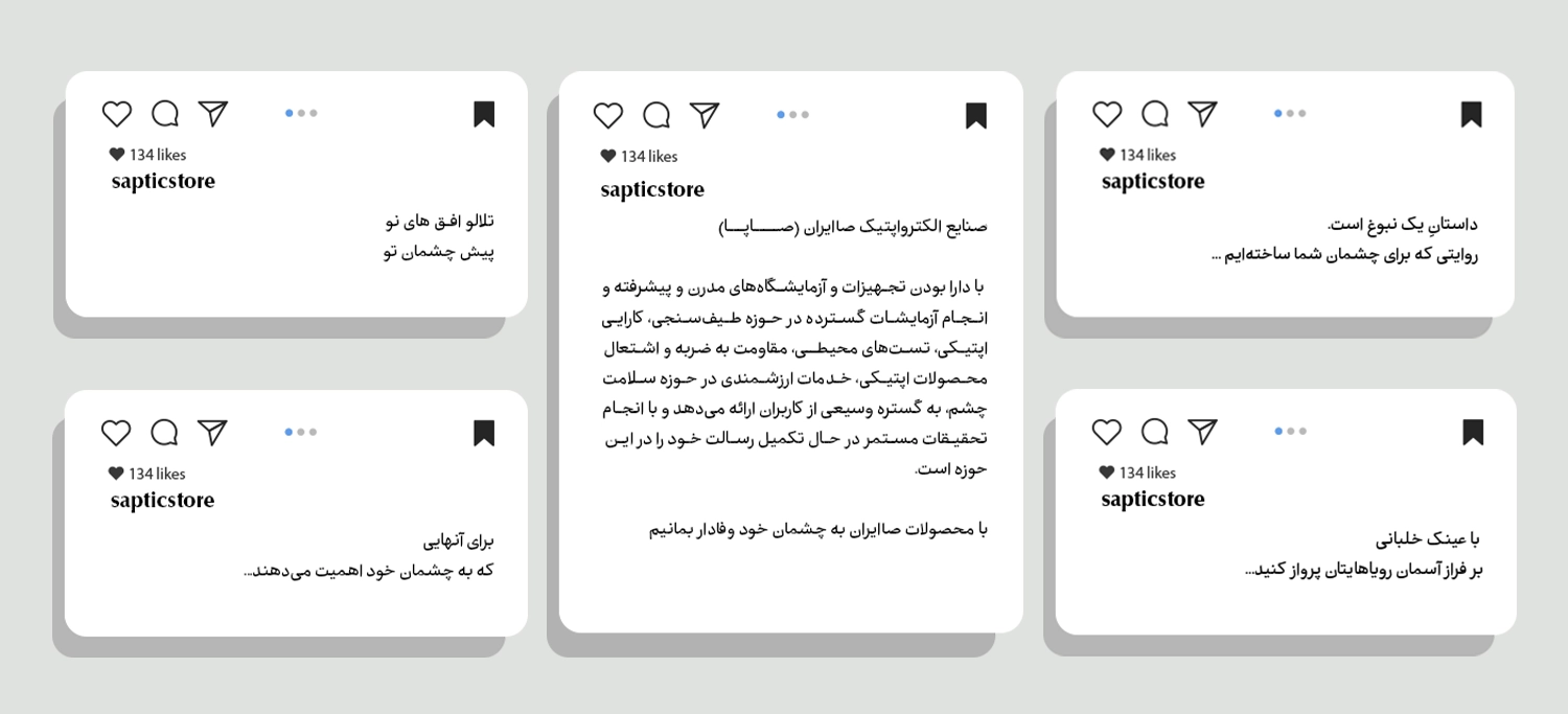 با اعـلام نیــروی هوایــی ارتــش مبنــی بــر اســتفاده از پرتوهــای لیــزری بــر علیــه خلبان هــا در جنگ هــای هوایــی، عینــک هــای ایمنــی لیــزر بــا فریــم خلبانــی در شــرکت صنایــع الکترواپتیــک صاایــران متولـد شـدند. این محصولات که شامل انواع عینک های افتابی و طبی هستند به اسم “صاپتیک” در بازارهای جهانی راه یافتند تا نمایش جلوه ای از اتحاد دانش فنی صاپا و دانش اپتیک باشند. این برند در حال حاضر علاوه بر به کارگیری دانـش و فـن پیـاده سـازی یـک عدســی ســالم و ایمــن توســط نخبــگان، اصول زیبایی را نیز در تولید رعایت می کند که این امر باعث شده تا از برترین های این عرصه محسوب شود. صاپتیک با هدف معرفی تنوع محصولات، رشد دادن برند و گسترش بازار فروش، فعالیت جدی خود را در فضای اینستاگرام آغاز کرد. از ابتدا سعی بر آن بود که محصولات با اتخاذ ایده های مختلف و خلاق نمایش داده شوند.چه به صورت کلی و چه در جزئی ترین ویژگی ها. ضمن آن که یکی از نقاط تمایز صاپتیک حضور پررنگ این برند در فضاهای نظامی و ارتشی ست و بخشی از برنامه تبلیغات نیز برای تاکید بر این نکته تنظیم شد. عکاسی از محصولات در فضاهای نظامی، نمایش نقش عینک ها در مشاغل این حوزه و توجه بیشتر به سلیقه مخاطبین نظامی و ارتشی پیج از این دسته برنامه ها بود. همچنین صاپتیک افتخار میکند که اولین برند ملی تولید عینک به صورت حرفه ای است و این مورد نیز در تولید محتوا و برنامه ریزی پیش برد پیج، حائز اهمیت قرار گرفت.